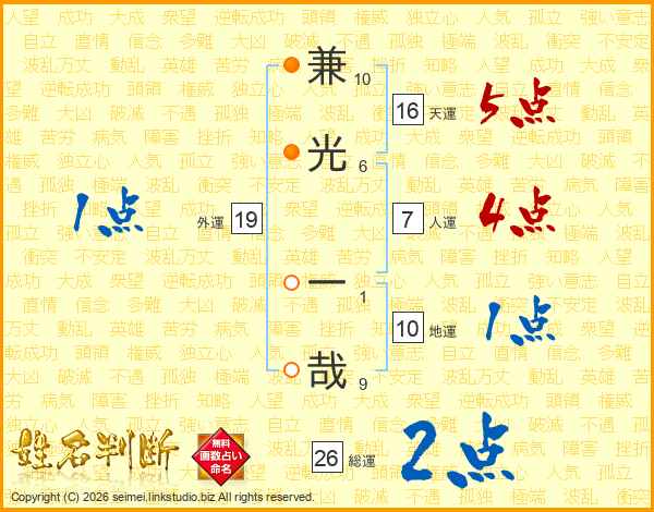 家系が持つ宿命的な運勢を表します。祖先から受け継いだ苗字ですので自分の力が及びません。家柄を象徴します。苗字の合計画数。