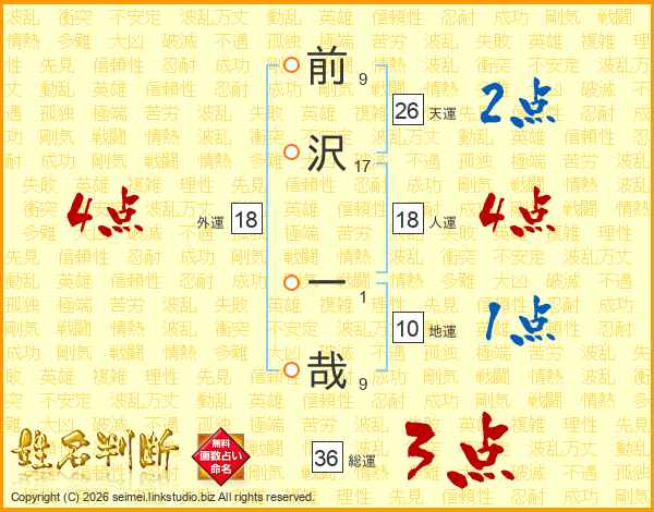 家系が持つ宿命的な運勢を表します。祖先から受け継いだ苗字ですので自分の力が及びません。家柄を象徴します。苗字の合計画数。