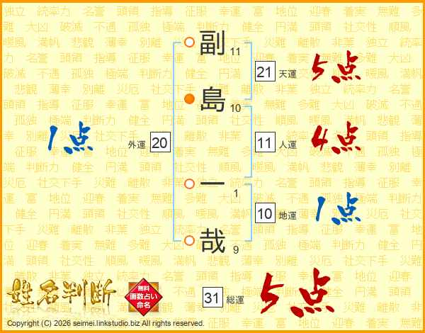 生活面を象徴する運勢です。外部から受ける影響力を表し、結婚運、家庭運や職場、環境への順応性を表します。総運から人運を引いた画数。姓や名が1文字の場合を除く。