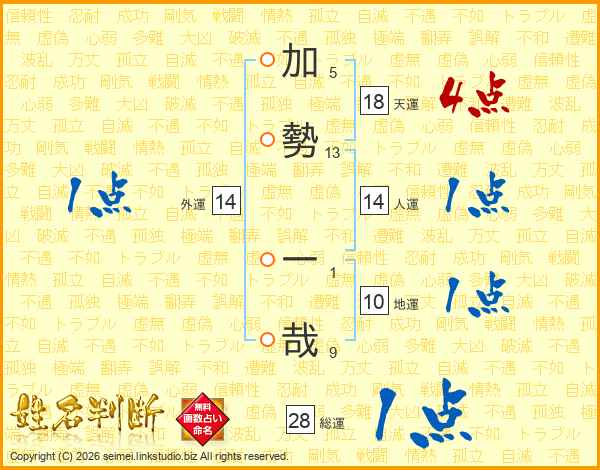 生活面を象徴する運勢です。外部から受ける影響力を表し、結婚運、家庭運や職場、環境への順応性を表します。総運から人運を引いた画数。姓や名が1文字の場合を除く。