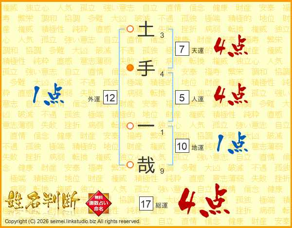 生活面を象徴する運勢です。外部から受ける影響力を表し、結婚運、家庭運や職場、環境への順応性を表します。総運から人運を引いた画数。姓や名が1文字の場合を除く。