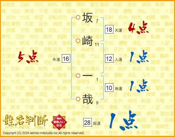 坂(7画)崎(11画) 一(1画)哉(9画)