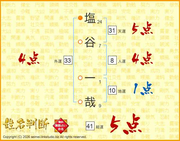 塩(24画)谷(7画) 一(1画)哉(9画)