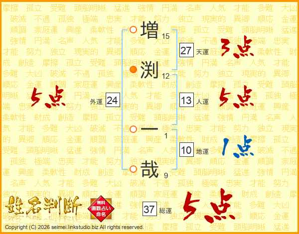 あなたの人生を表す1番重要な運勢です。生涯を通じて影響する総合運となり、主に50歳以降の晩年期に影響を及ぼします。苗字と名前の合計画数。