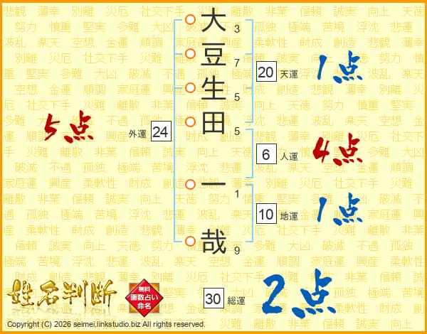 大豆生田一哉さんの総運は30画の2点!
