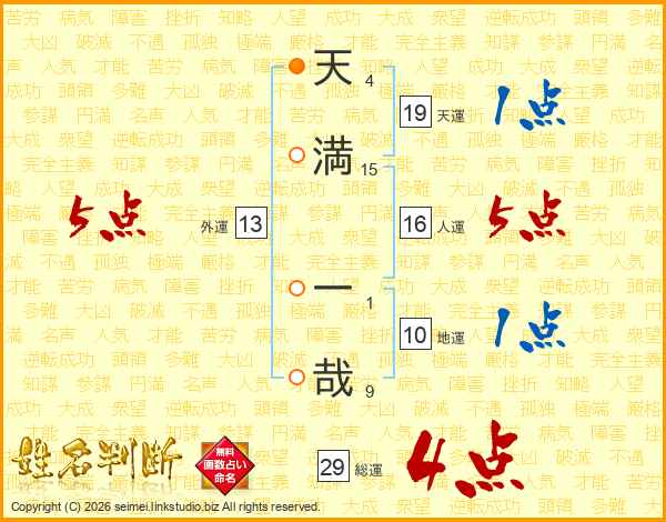 天(4画)満(15画) 一(1画)哉(9画)