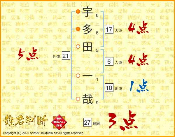 宇(6画)多(6画)田(5画) 一(1画)哉(9画)