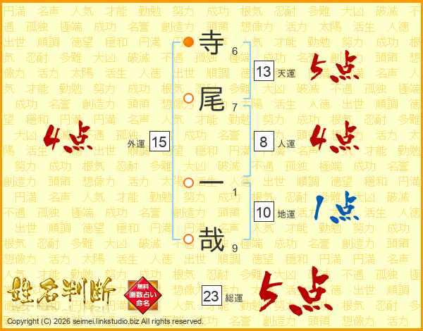 寺(6画)尾(7画) 一(1画)哉(9画)