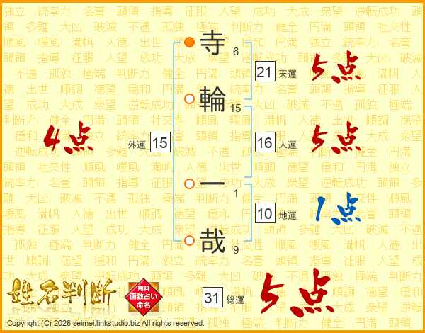 寺(6画)輪(15画) 一(1画)哉(9画)