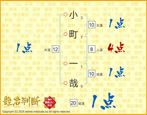 生活面を象徴する運勢です。外部から受ける影響力を表し、結婚運、家庭運や職場、環境への順応性を表します。総運から人運を引いた画数。姓や名が1文字の場合を除く。