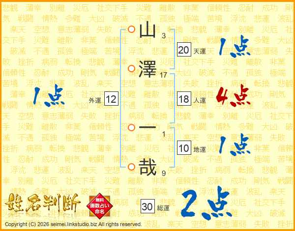 生活面を象徴する運勢です。外部から受ける影響力を表し、結婚運、家庭運や職場、環境への順応性を表します。総運から人運を引いた画数。姓や名が1文字の場合を除く。