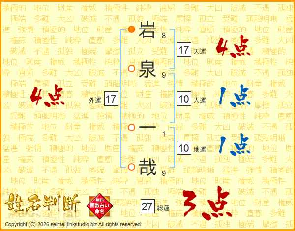 岩(8画)泉(9画) 一(1画)哉(9画)