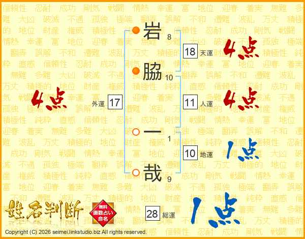 岩(8画)脇(10画) 一(1画)哉(9画)