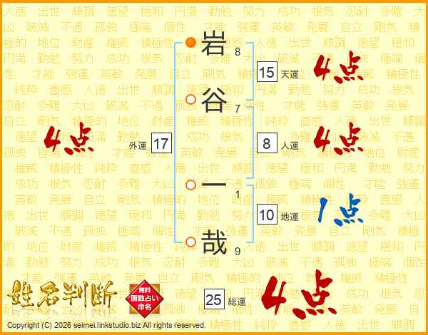 岩(8画)谷(7画) 一(1画)哉(9画)