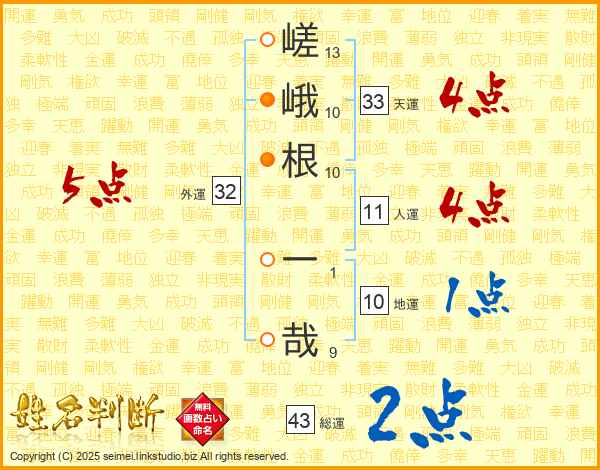 嵯(13画)峨(10画)根(10画) 一(1画)哉(9画)