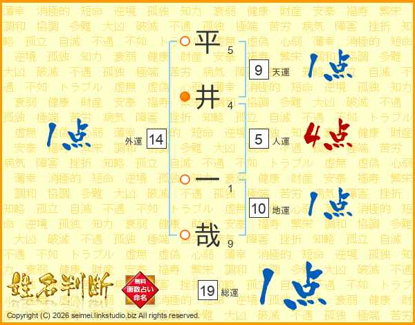 生活面を象徴する運勢です。外部から受ける影響力を表し、結婚運、家庭運や職場、環境への順応性を表します。総運から人運を引いた画数。姓や名が1文字の場合を除く。