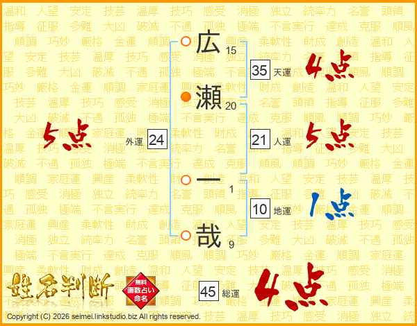 広(15画)瀬(20画) 一(1画)哉(9画)