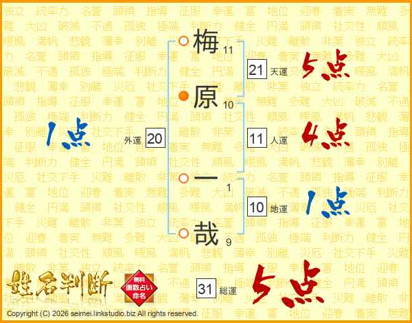 梅原一哉さんの総運は31画の5点!