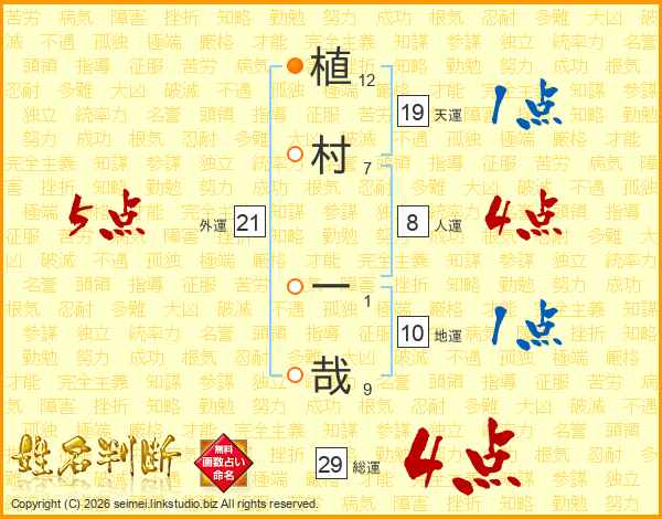 植(12画)村(7画) 一(1画)哉(9画)