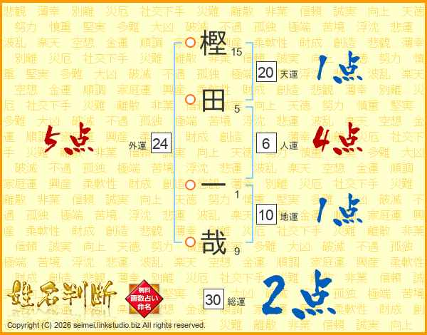 生活面を象徴する運勢です。外部から受ける影響力を表し、結婚運、家庭運や職場、環境への順応性を表します。総運から人運を引いた画数。姓や名が1文字の場合を除く。