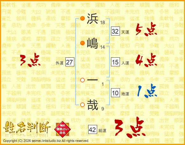 浜(18画)嶋(14画) 一(1画)哉(9画)