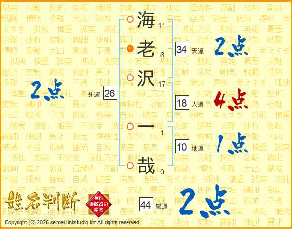 海(11画)老(6画)沢(17画) 一(1画)哉(9画)