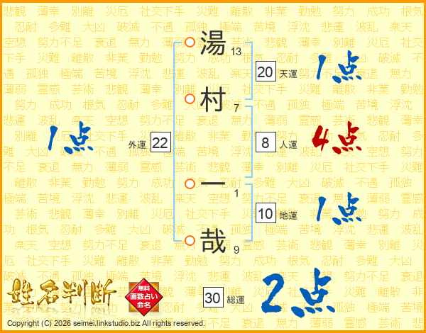 生活面を象徴する運勢です。外部から受ける影響力を表し、結婚運、家庭運や職場、環境への順応性を表します。総運から人運を引いた画数。姓や名が1文字の場合を除く。