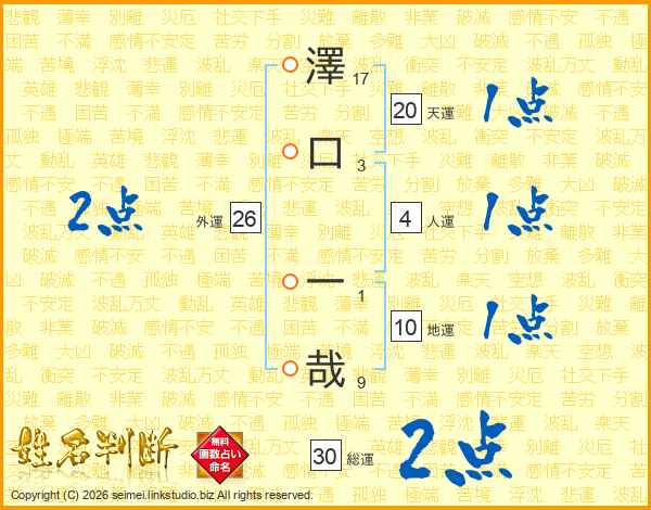 生活面を象徴する運勢です。外部から受ける影響力を表し、結婚運、家庭運や職場、環境への順応性を表します。総運から人運を引いた画数。姓や名が1文字の場合を除く。