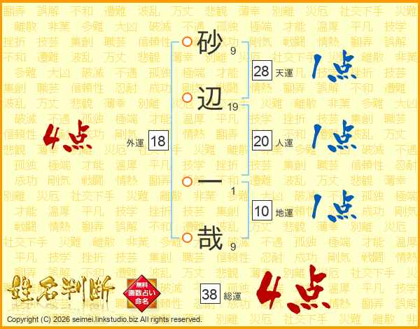 砂(9画)辺(19画) 一(1画)哉(9画)