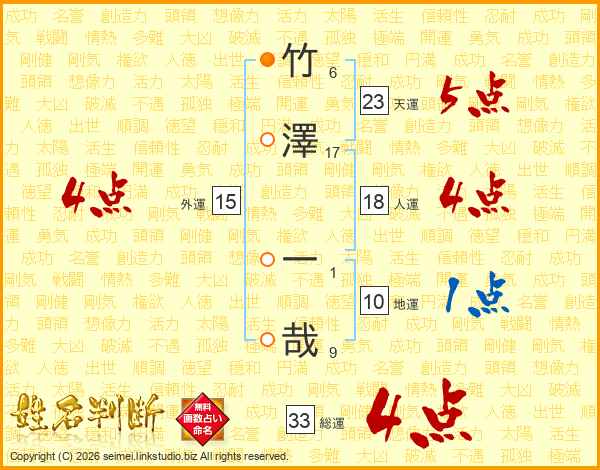 竹(6画)澤(17画) 一(1画)哉(9画)