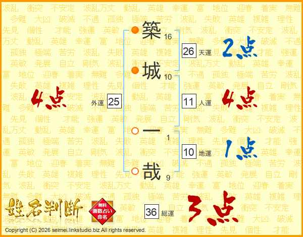 生活面を象徴する運勢です。外部から受ける影響力を表し、結婚運、家庭運や職場、環境への順応性を表します。総運から人運を引いた画数。姓や名が1文字の場合を除く。