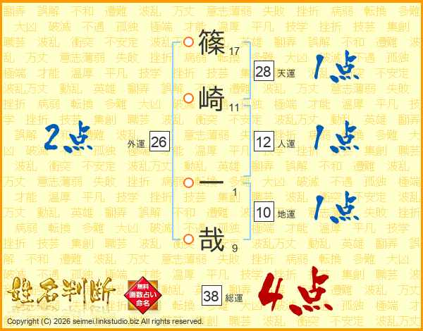 篠(17画)崎(11画) 一(1画)哉(9画)
