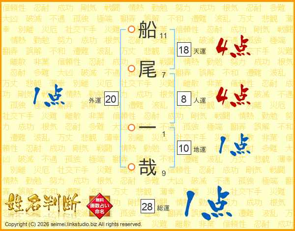 船(11画)尾(7画) 一(1画)哉(9画)