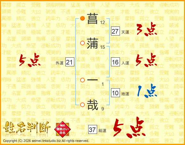 菖(12画)蒲(15画) 一(1画)哉(9画)