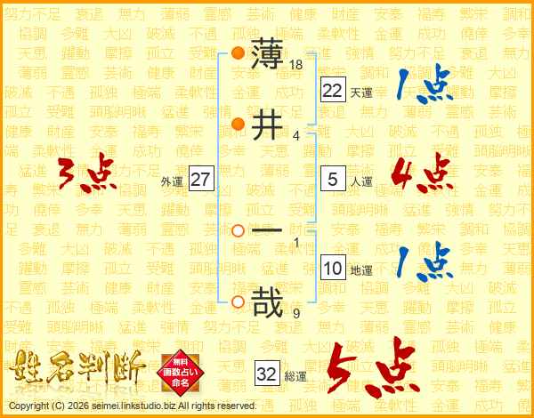 生活面を象徴する運勢です。外部から受ける影響力を表し、結婚運、家庭運や職場、環境への順応性を表します。総運から人運を引いた画数。姓や名が1文字の場合を除く。