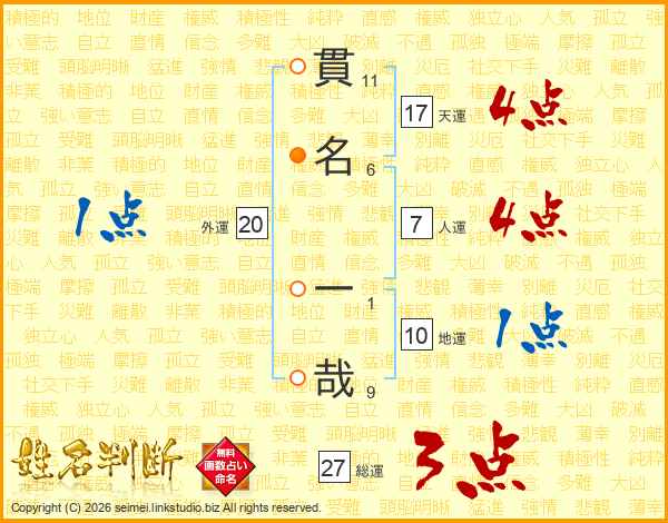 貫(11画)名(6画) 一(1画)哉(9画)