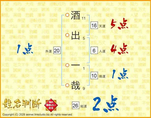 生活面を象徴する運勢です。外部から受ける影響力を表し、結婚運、家庭運や職場、環境への順応性を表します。総運から人運を引いた画数。姓や名が1文字の場合を除く。