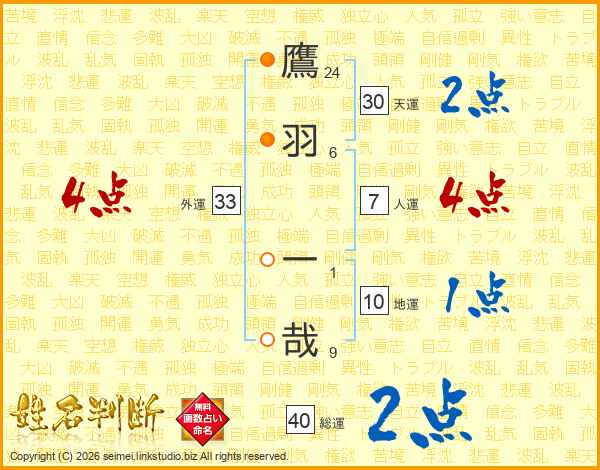 鷹(24画)羽(6画) 一(1画)哉(9画)