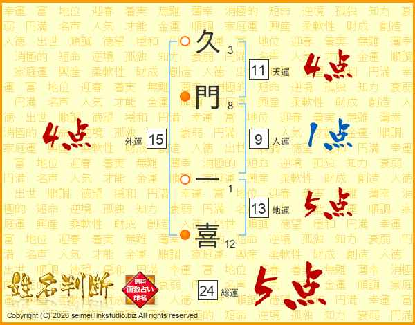 生活面を象徴する運勢です。外部から受ける影響力を表し、結婚運、家庭運や職場、環境への順応性を表します。総運から人運を引いた画数。姓や名が1文字の場合を除く。