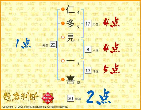 仁(4画)多(6画)見(7画) 一(1画)喜(12画)