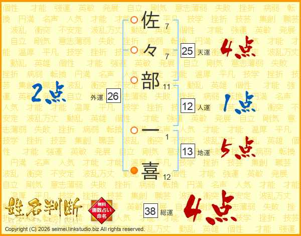 佐(7画)々(7画)部(11画) 一(1画)喜(12画)