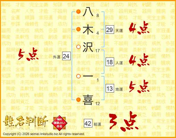 八(8画)木(4画)沢(17画) 一(1画)喜(12画)