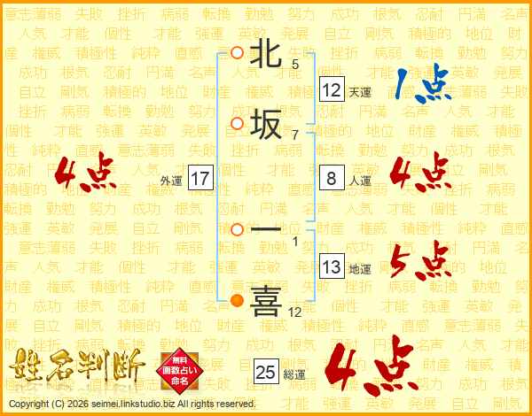 生活面を象徴する運勢です。外部から受ける影響力を表し、結婚運、家庭運や職場、環境への順応性を表します。総運から人運を引いた画数。姓や名が1文字の場合を除く。