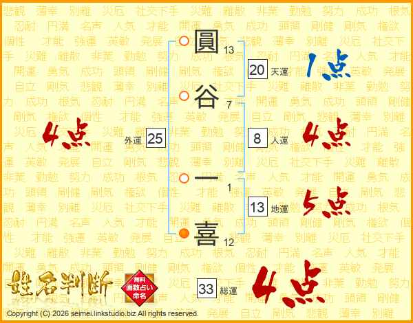 圓(13画)谷(7画) 一(1画)喜(12画)
