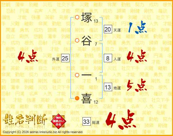 塚(13画)谷(7画) 一(1画)喜(12画)
