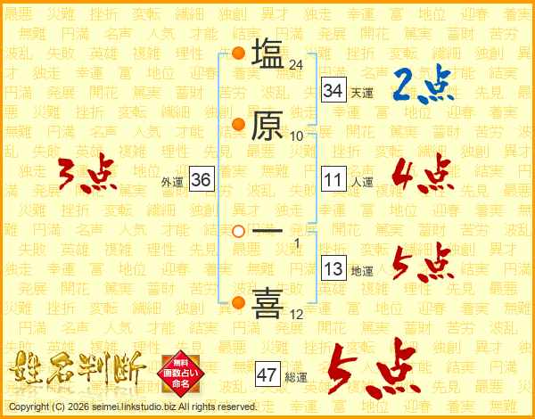 塩原一喜さんの総運は47画の5点!