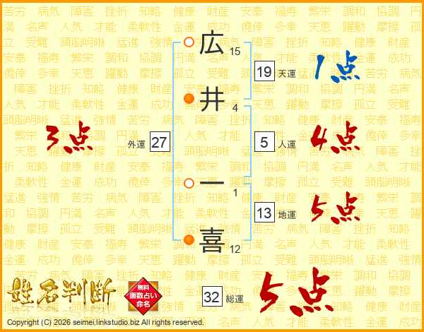 生活面を象徴する運勢です。外部から受ける影響力を表し、結婚運、家庭運や職場、環境への順応性を表します。総運から人運を引いた画数。姓や名が1文字の場合を除く。