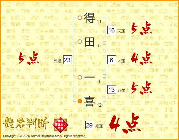 得田一喜さんの総運は29画の4点!