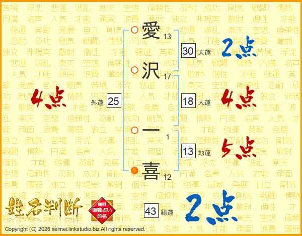 愛沢一喜さんの総運は43画の2点!