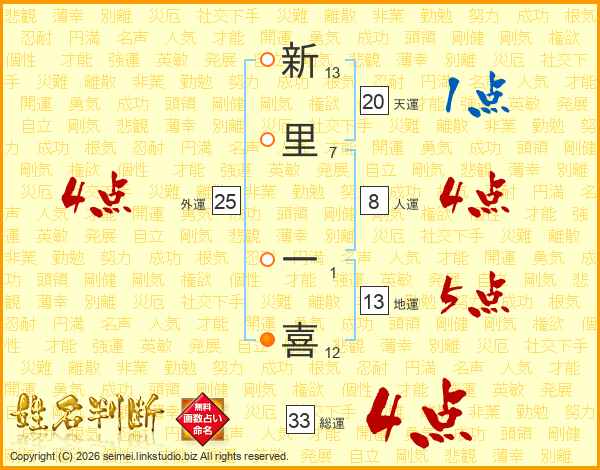 生活面を象徴する運勢です。外部から受ける影響力を表し、結婚運、家庭運や職場、環境への順応性を表します。総運から人運を引いた画数。姓や名が1文字の場合を除く。